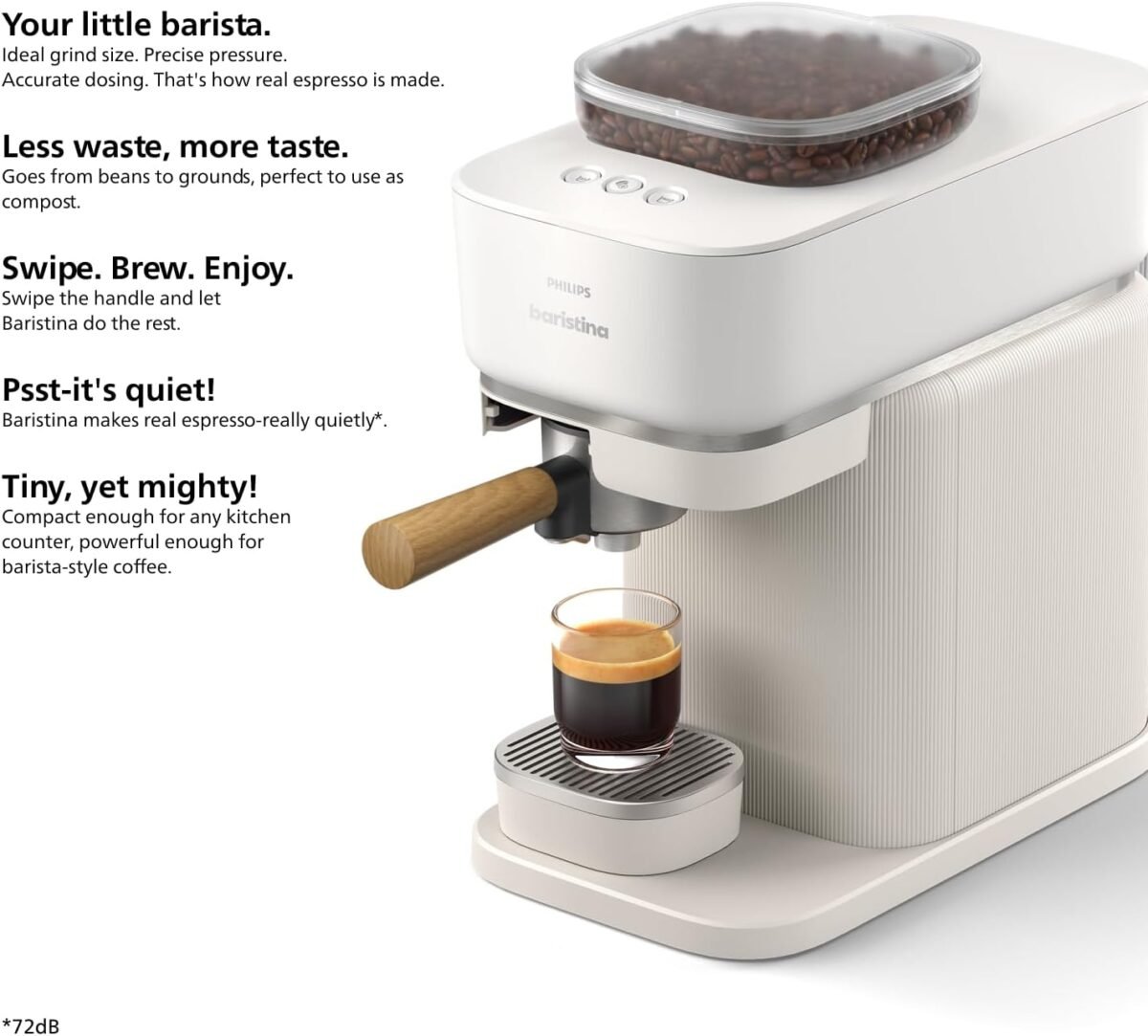 - Espresso real, hecho sencillo: Baristina muele, apisona y prepara con una bomba de presión de 16 bar para extraer un sabor robusto de sus granos.