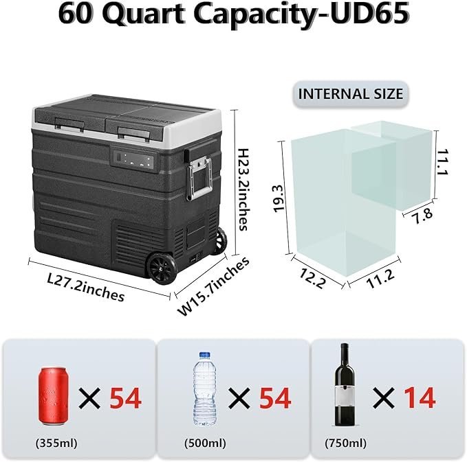 Oferta por tiempo limitado:Congelador portátil para auto con ruedas Alpicool UD65 con dos compartimentos, refrigerador de 12 voltios, 60 cuartos de galón de enfriamiento rápido, con 12/24 V CC y 100-240 V CA para exteriores, camping, autocaravanas y camiones.